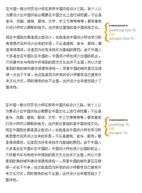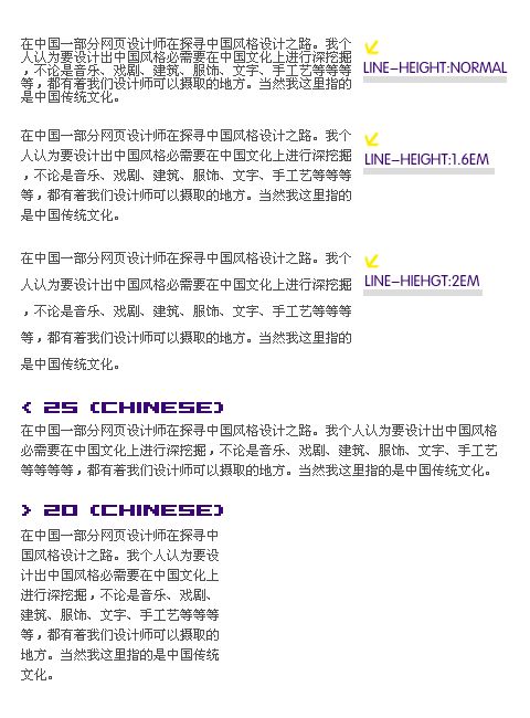 第三個是比較寬的,松了一點,這樣看起來也很清楚,但是當(dāng)你的文章不是一兩行而是十幾行與幾十行的時候你就會覺得文章的連貫性產(chǎn)生了很嚴(yán)重的脫節(jié),一般排版不會越過兩個字體高度(2em)。