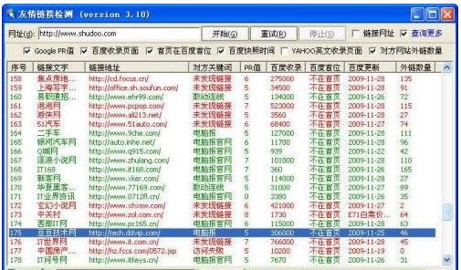 軟件操作非常簡單,運行軟件后只需輸入自己網(wǎng)站的網(wǎng)址,點擊“開始”后便自動開始檢測。軟件自動檢測對方網(wǎng)站的收錄、PR值等信息。如果嫌軟件太麻煩,還可以登錄http://link.chinaz.com,進(jìn)行在線檢測。