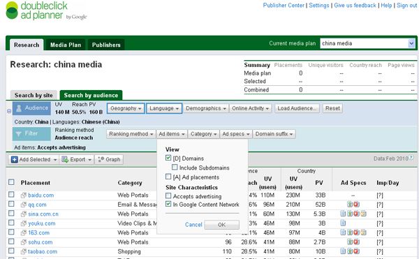 a、通過(guò)Google Ad Planaer 及Google Adwords展示位置工具(根據(jù)行業(yè)、描述、網(wǎng)址條件篩選目標(biāo)站點(diǎn)),尋找高質(zhì)量的內(nèi)容網(wǎng)絡(luò)站點(diǎn)。Google Ad Planaer支持國(guó)家、地區(qū)、語(yǔ)言、行業(yè)、所支持的廣告規(guī)格等綜合條件來(lái)篩選目標(biāo)站點(diǎn)。