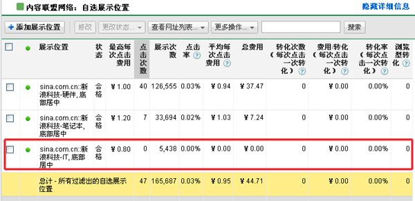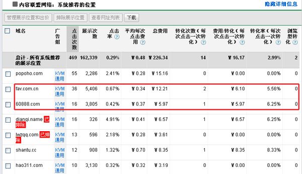 如果您啟用了Google Adwords轉(zhuǎn)化跟蹤工具,您也可以看到每個(gè)站點(diǎn)對(duì)應(yīng)的轉(zhuǎn)換數(shù)據(jù)。我們可以根據(jù)每次轉(zhuǎn)換成本來(lái)評(píng)估媒介的質(zhì)量。但是Google Adwords轉(zhuǎn)化跟蹤如果配置不合理可能會(huì)嚴(yán)重影響對(duì)媒介質(zhì)量的判斷,依靠谷歌分析來(lái)分析流量質(zhì)量會(huì)更可靠一些。