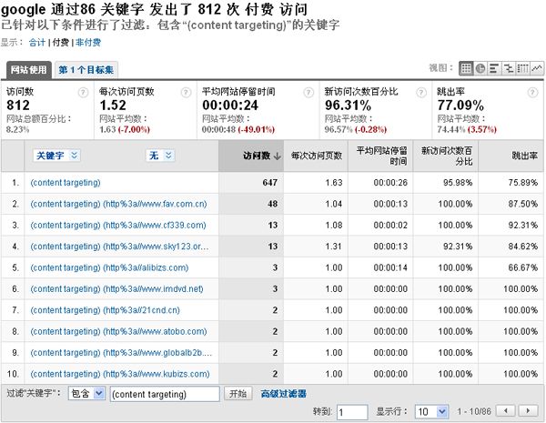 我們可以通過(guò)幾個(gè)重要指標(biāo)來(lái)評(píng)估內(nèi)容站點(diǎn)的質(zhì)量(平均停留時(shí)間、跳出率、KPI轉(zhuǎn)換率),排除流量質(zhì)量和KPI轉(zhuǎn)換效果較差的站點(diǎn),添加新的相關(guān)內(nèi)容網(wǎng)絡(luò)站點(diǎn)。不斷執(zhí)行優(yōu)化的過(guò)程中,您可能會(huì)驚喜的發(fā)現(xiàn)您的廣告投資回報(bào)率在不斷增長(zhǎng)。 如果您的Google Adwords帳戶已經(jīng)和谷歌分析(Google Analytics)帳戶鏈接整合,那么您可以通過(guò)谷歌分析報(bào)表數(shù)據(jù),分析出以網(wǎng)站定位廣告系列中的所有站點(diǎn)的質(zhì)量。