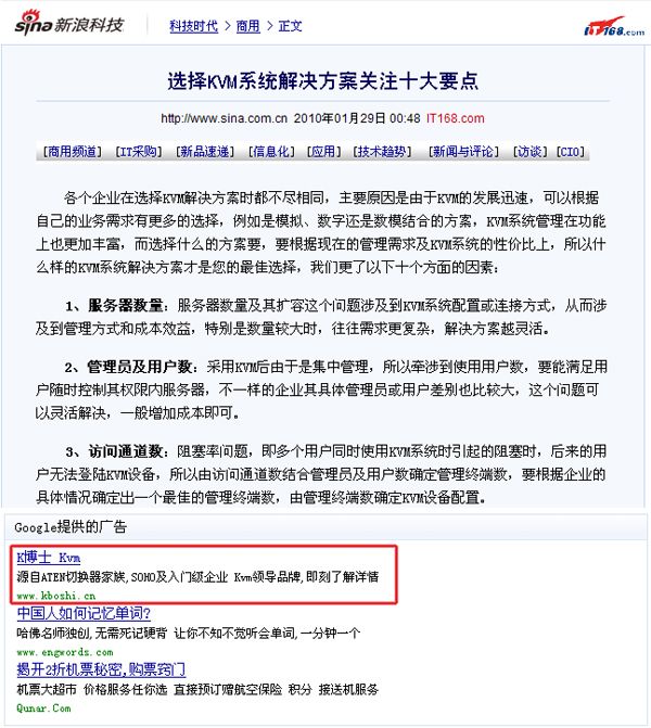 谷歌內(nèi)容廣告關(guān)鍵字匹配機(jī)制,是對(duì)細(xì)分群體定位的關(guān)鍵設(shè)置。(設(shè)置關(guān)鍵字匹配機(jī)制前,您一定要先了解您目標(biāo)客戶的關(guān)注點(diǎn)) 如果您設(shè)置過(guò)多的關(guān)鍵詞,那很有可能很多潛在的客戶根本無(wú)法看到你的廣告;如果您設(shè)置的關(guān)鍵詞太少,會(huì)影響匹配的精確性。在上面的圖示中,我們可以看到新浪上”KVM”相關(guān)的文章,匹配到K博士這組廣告。如果有許多競(jìng)爭(zhēng)對(duì)手同時(shí)也投放到此網(wǎng)站,并且也是定義的”KVM”關(guān)鍵詞,在出價(jià)相同的條件下,K博士這組廣告毫無(wú)優(yōu)勢(shì)可言,但是如果我們定義2個(gè)關(guān)鍵詞”KVM”+”解決方案” 那么在這組頁(yè)面中我們的廣告相關(guān)性就更高,在出價(jià)相同的條件下,我們可以獲得更多的展示機(jī)會(huì)。