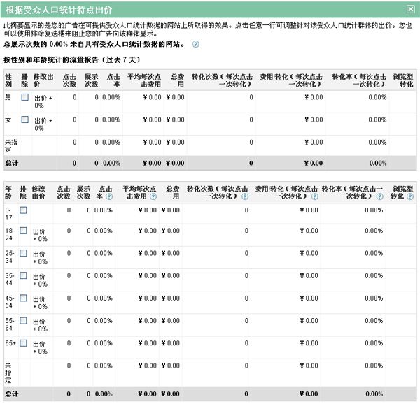谷歌內(nèi)容網(wǎng)絡(luò)最具特色的一個(gè)功能,針對(duì)群體性別和年齡來(lái)定位,我們可以排除一些不可能使用我們產(chǎn)品的群體,還可以針對(duì)不同的群體設(shè)定不同的出價(jià)比例。 例如:我們?cè)谕茝V一款網(wǎng)站分析監(jiān)測(cè)的產(chǎn)品,這部分群體大部分都是WA分析師在使用,群體大致在25~34歲之間,那么我們可以將此年齡群體的出價(jià)提升10%,這個(gè)群體類型的用戶將會(huì)有更多幾率看到我們的內(nèi)容網(wǎng)絡(luò)廣告。 這個(gè)功能準(zhǔn)確性有待驗(yàn)證!
