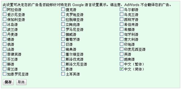 谷歌內(nèi)容網(wǎng)絡(luò)語(yǔ)言定位設(shè)置,直接關(guān)系到你投放廣告的精確性。試想如果您在阿拉伯語(yǔ)系的國(guó)家投放西班牙語(yǔ)的廣告,或者您在巴西投放德語(yǔ)廣告,會(huì)有什么后果!如果你在投放簡(jiǎn)體中文一個(gè)語(yǔ)系的廣告,直接選擇簡(jiǎn)體中文語(yǔ)言的配置即可。 如果您在投放多語(yǔ)系的廣告,就需要研究當(dāng)?shù)貒?guó)家什么語(yǔ)言是官方語(yǔ)言。需要注意的是:選擇語(yǔ)言配置后當(dāng)然也要制作針對(duì)這個(gè)語(yǔ)言的廣告創(chuàng)意和Landing page頁(yè)面。