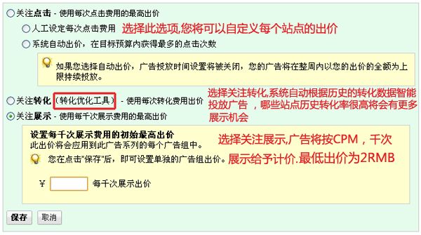 通常我們選擇”人工設(shè)定每次點(diǎn)擊費(fèi)用”即可! 如果我們投放的站點(diǎn)廣告點(diǎn)擊率非常之高,或者我們投放站點(diǎn)競(jìng)爭(zhēng)對(duì)手廣告非常多,那么我們可以考慮采用千次展示費(fèi)用出價(jià),盡可能獲得更多的展示機(jī)會(huì)??傊梢試L試不同的出價(jià)模式,看哪種模式投資回報(bào)率更高了! 按照展示來(lái)出價(jià)的選項(xiàng)必須要啟動(dòng)谷歌ADWORDS轉(zhuǎn)換優(yōu)化工具,才可以使用!系統(tǒng)會(huì)根據(jù)歷史轉(zhuǎn)換來(lái)智能投放,歷史轉(zhuǎn)換高的站點(diǎn)有更高的展示機(jī)會(huì),此選項(xiàng)不建議新手使用。我曾經(jīng)嘗試過(guò)使用此選項(xiàng),但是轉(zhuǎn)化效果遠(yuǎn)不如使用“人工設(shè)定每次點(diǎn)擊費(fèi)用”選項(xiàng)配置。