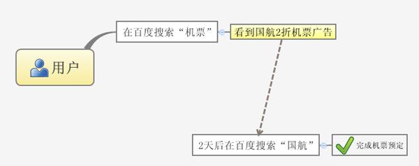 上圖中我們可以看出,國(guó)航的關(guān)鍵詞廣告”機(jī)票”及相關(guān)廣告創(chuàng)意,影響用戶去搜索”國(guó)航”的行為。這種關(guān)鍵字之間對(duì)用戶搜索行為的影響,實(shí)際也會(huì)損失許多潛在搜索流量。如果廣告主去投放某個(gè)關(guān)鍵詞,或者某組關(guān)鍵詞,也未必可以涵蓋用戶所有的搜索行為。 低覆蓋率是關(guān)鍵詞廣告最大的弊端!