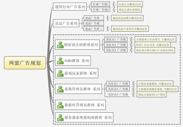 以上的規(guī)劃結(jié)構(gòu)圖,只是舉了一個(gè)典型的示例。實(shí)際投放中都可以做靈活部署。主要分為三個(gè)主要部分,1、行業(yè)廣告系列:使用行業(yè)通用關(guān)鍵詞去匹配廣告,當(dāng)然如果在指定網(wǎng)站的條件下使用關(guān)鍵詞去匹配網(wǎng)盟廣告,精確度會(huì)更高。 2、競(jìng)品廣告系列: 試想如果所有和競(jìng)品相關(guān)的內(nèi)容都出現(xiàn)我們的廣告,想必會(huì)導(dǎo)入許多競(jìng)爭(zhēng)對(duì)手的用戶群體。 3、目標(biāo)群體廣告系列:針對(duì)每個(gè)細(xì)分群體的關(guān)注點(diǎn)來(lái)做網(wǎng)盟投放,針對(duì)性會(huì)更強(qiáng)。這種規(guī)劃能在保證用戶覆蓋率的條件下更精準(zhǔn)的將網(wǎng)盟廣告推送到目標(biāo)群體!我們還可以借助第三方的目標(biāo)群體定位來(lái)做廣告覆蓋,例如:”橘子酒店” 的主要目標(biāo)群體都是設(shè)計(jì)師群體,我們完全可以借助網(wǎng)盟平臺(tái)覆蓋許多關(guān)注橘子酒店的群體!