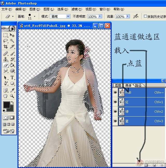 婚紗摳圖方法有很多,通道摳圖是個(gè)不錯(cuò)的選擇。大致過(guò)程:先需要用鋼筆等工具把人物部分摳出來(lái)包括婚紗部分。然后把摳出的人物圖層復(fù)制一層,在通道選區(qū)婚紗部分較為清晰的通道并調(diào)出選區(qū),回到圖層面板后把選區(qū)反選按刪除高光部分以外的圖像,得到的圖像就是我們摳出的婚紗部分,后期再適當(dāng)調(diào)亮即可。