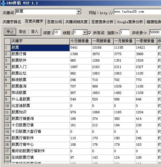 以前百度會提供相關(guān)搜索更多頁面,但是后來被百度關(guān)閉了,只有競價用戶才能看到,這部門關(guān)鍵字?jǐn)?shù)據(jù)是非常有用的,之后便產(chǎn)生了很多的關(guān)鍵字選取軟件,軟件的數(shù)據(jù)來源是百度指數(shù),也就是原先的相關(guān)搜索,比如最常見的有SEO伴侶,SEO助手(這兩款都是付費軟件)免費的也可以用,但是出來的關(guān)鍵字很少,而且可能還被禁止導(dǎo)出,SEO伴侶我一直在用,價格一年也就幾十元,我記得好像是35元!SEO助手價格相對比較貴,但是里面除了這個功能外,其他功能還有很多,還有最新的一個網(wǎng)站叫追詞網(wǎng)(http://www.zhuici.com/ )這個網(wǎng)站不需要給錢,但是需要用一個PR=3的鏈接換取VIP會員級別,有資源的可以去用一下!下面我以SEO伴侶為示范,找出“股票”相關(guān)的關(guān)鍵字~~