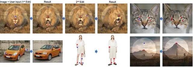1. 基于點(diǎn)的編輯:DragGAN允許用戶通過(guò)在屏幕上拖動(dòng)和放置點(diǎn)來(lái)直接更改圖像。這可以實(shí)現(xiàn)比傳統(tǒng)圖片編輯軟件更準(zhǔn)確和逼真的調(diào)整。